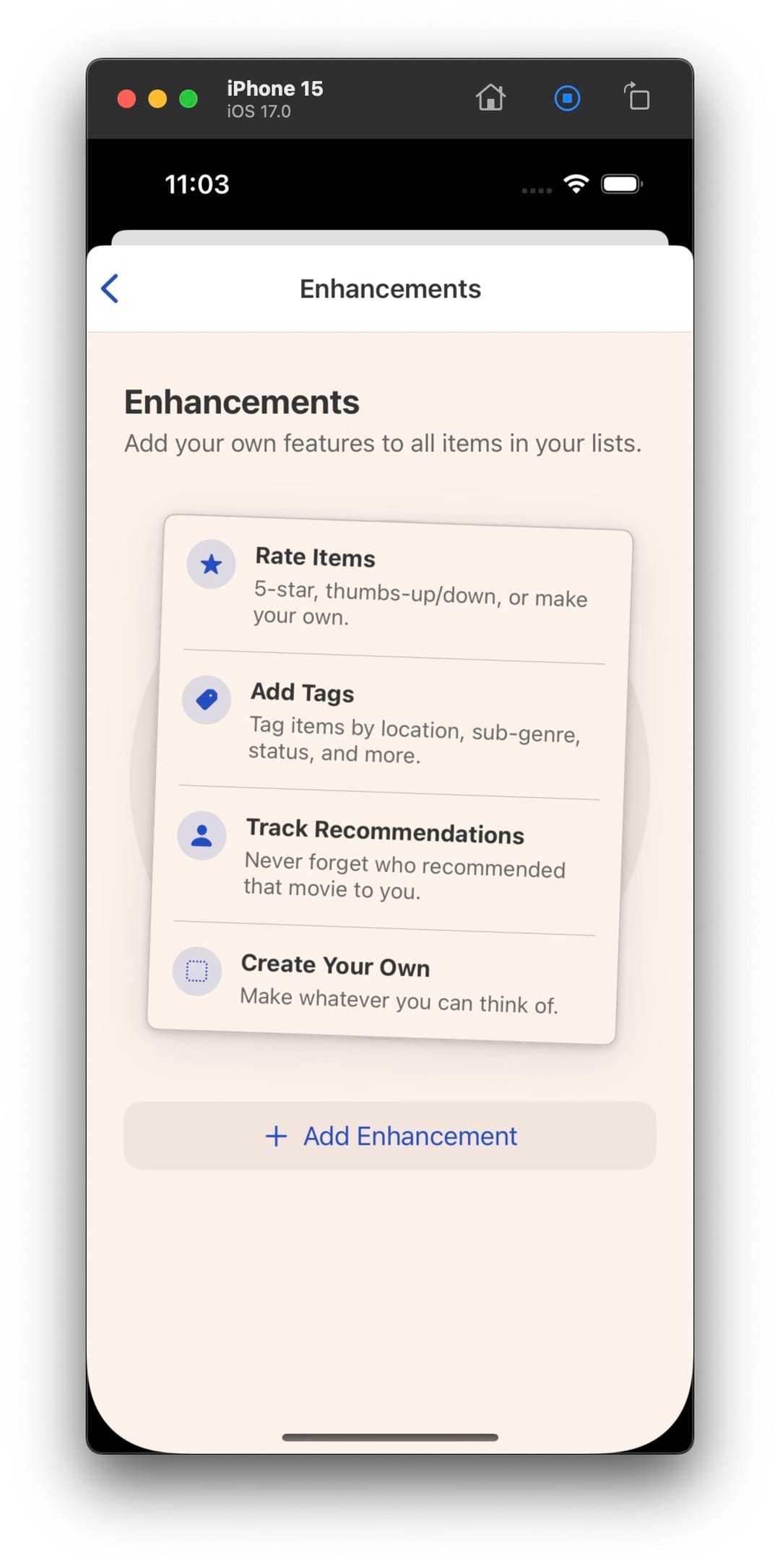 I liked that this gave people handy, scannable information about what’s inside each list, but also brought a quirky style to the app.